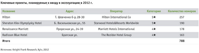 Несмотря на планы девелоперов открыть строящиеся гостиницы до начала чемпионата ЕВРО-2012, не все объекты были введены в эксплуатацию.Сдача ряда объектов на II полугодие 2012 г. и на 2013 г. До конца текущего года в Киеве ожидается открытие еще четырех гостиниц общим фондом в 788 номеров. Все объекты будут работать под управлением международных операторов.