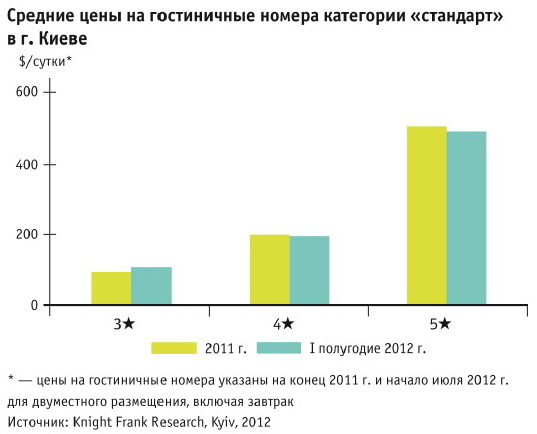 На конец первого полугодия 2012 г. стоимость стандартного двухместного номера с завтраком в гостиницах категории 5★ находилась в диапазоне $450-550/сутки, а в гостиницах категории 4★ и 3★ - $140-350 и $60-160 соответственно. Цены в гостиницах категории 5★ выставляются преимущественно в евро, в гостиницах категории 4★ – в евро и в гривнах, в гостиницах 3★ – в гривнах. Рост цен за проживание в гостиницах во время ЕВРО-2012 носил временный характер. Стоимость проживания в дни проведения футбольных матчей превышала обычную цену номера в 1,5-2 раза, но сразу после окончания чемпионата произошел возврат цен к исходным значениям.
