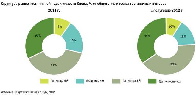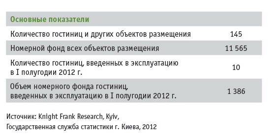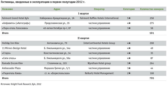 В течение первого полугодия 2012 г. в Киеве было введено в эксплуатацию десять гостиниц категории 2-5 с общим номерным фондом 1 386 номеров. Список международных гостиничных операторов, управляющих гостиницами в Киеве, пополнился двумя новыми именами — Fairmont Raffles Hotels International и Wyndham Hotel Group.