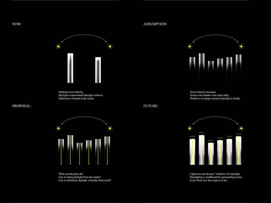 2050 год. В отчаянном поиске природного дневного света меняют конфигурацию домов-башен. Их оснащают стеклянными ядрами, в которые поступает активный солнечный свет с крыш. Дневной свет передается глубоко внутрь здания через отражатели, свето-передающие стеклянные ядра, оптические кабели, линзы и прозрачные внутренние перегородки.
