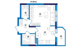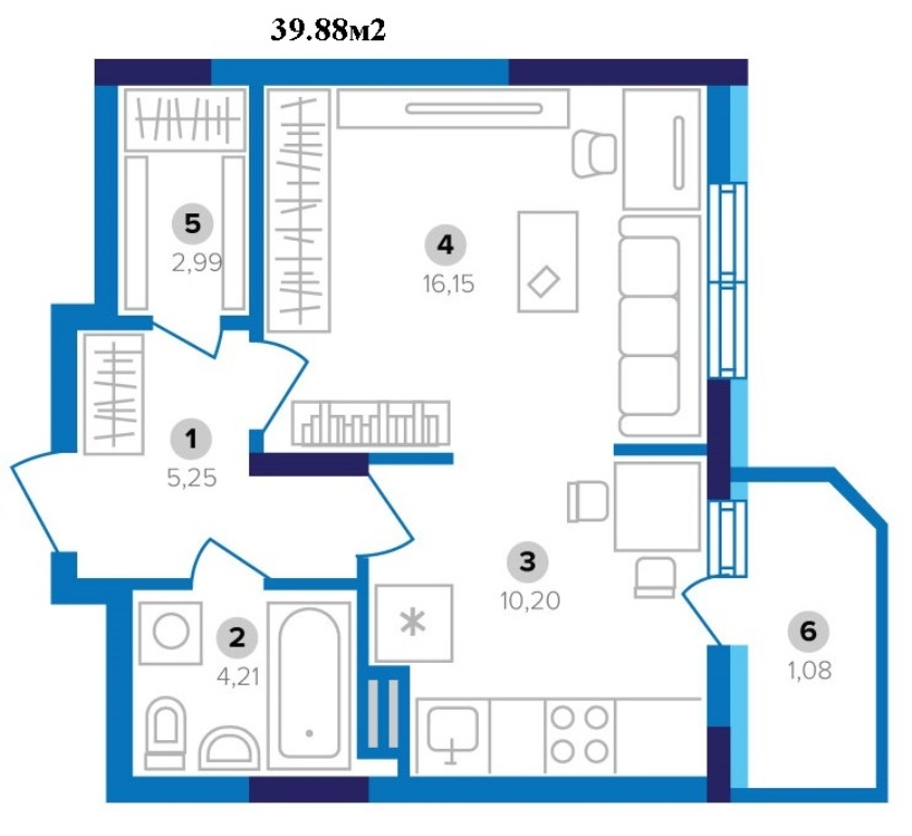 Загальна площа квартири 39.88м, житлова 16.15м, кухня 10.20. Великий санвузол 4.21м, гардеробна кімната 2.99м, балкон 1.08.