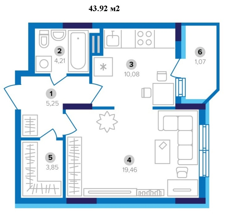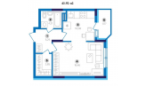 Загальна площа квартири 39.88м, житлова 16.15м, кухня 10.20. Великий санвузол 4.21м, гардеробна кімната 2.99м, балкон 1.08.