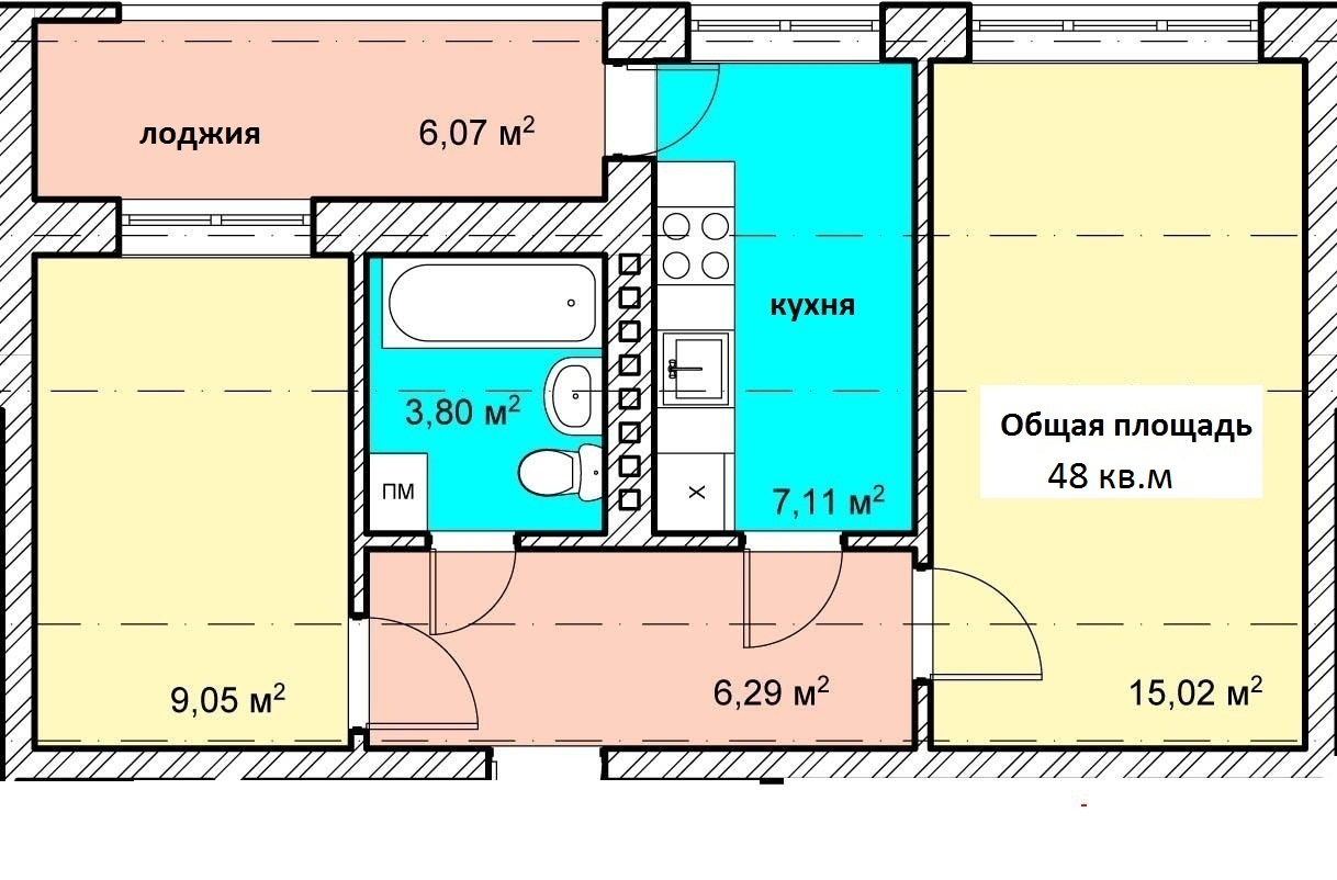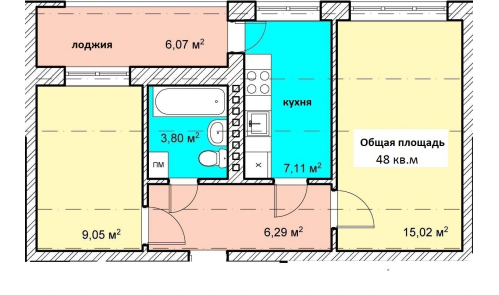 | Площадь (м.кв.) | жилая: 24, кухня: 7, общая: 48 |