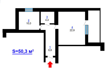 | Площадь (м.кв.) | жилая: 23, кухня: 10, общая: 50 |