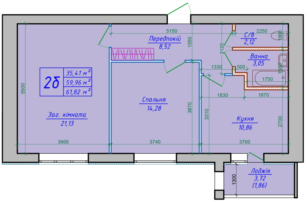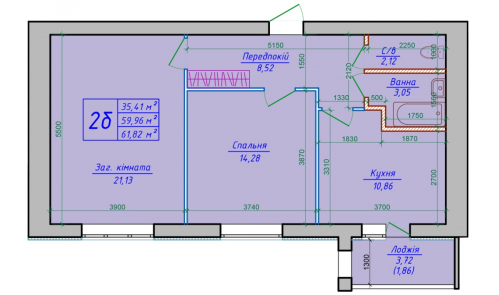 | Площадь (м.кв.) | жилая: 35.41, кухня: 10.86, общая: 61.82 |