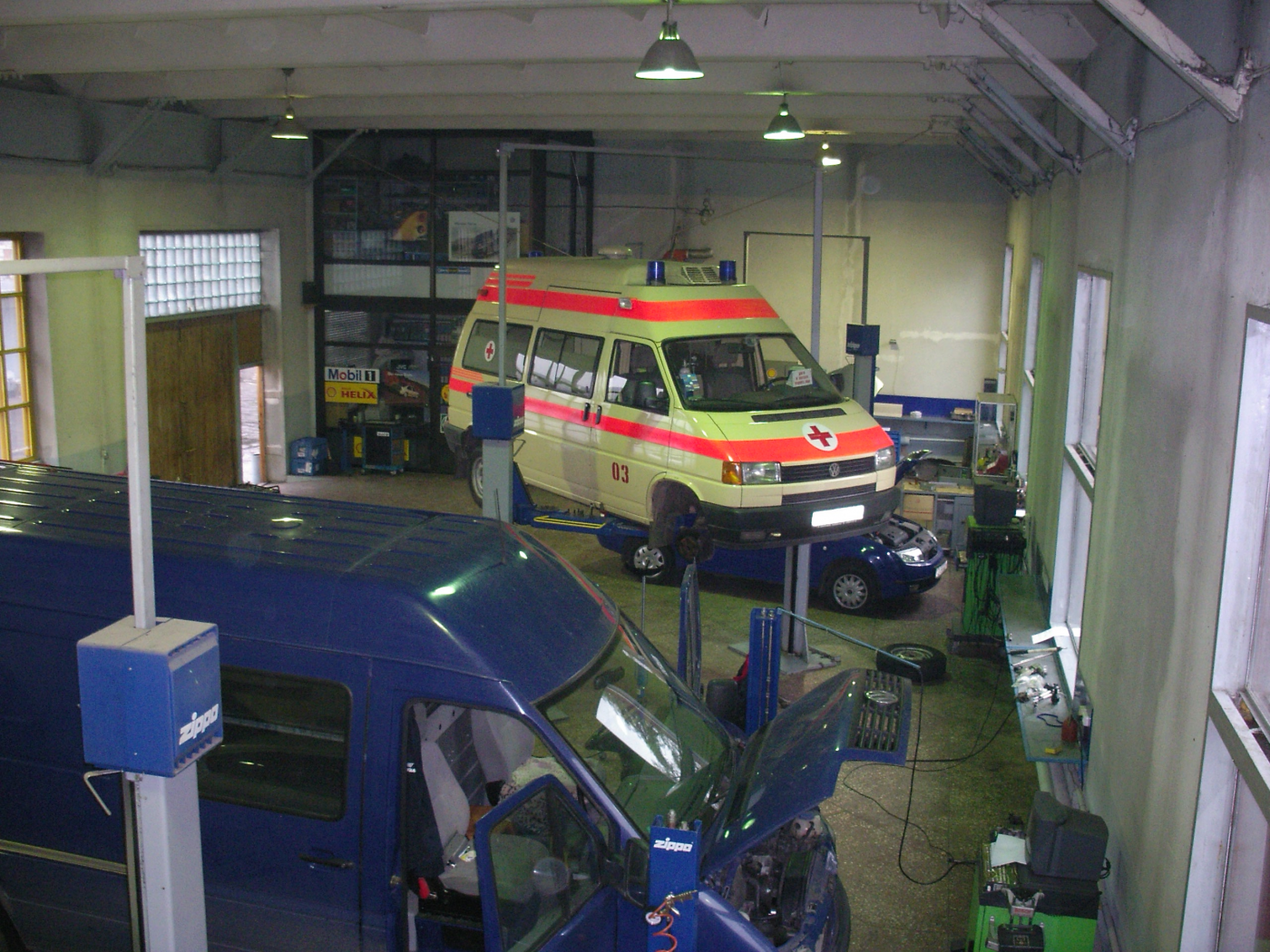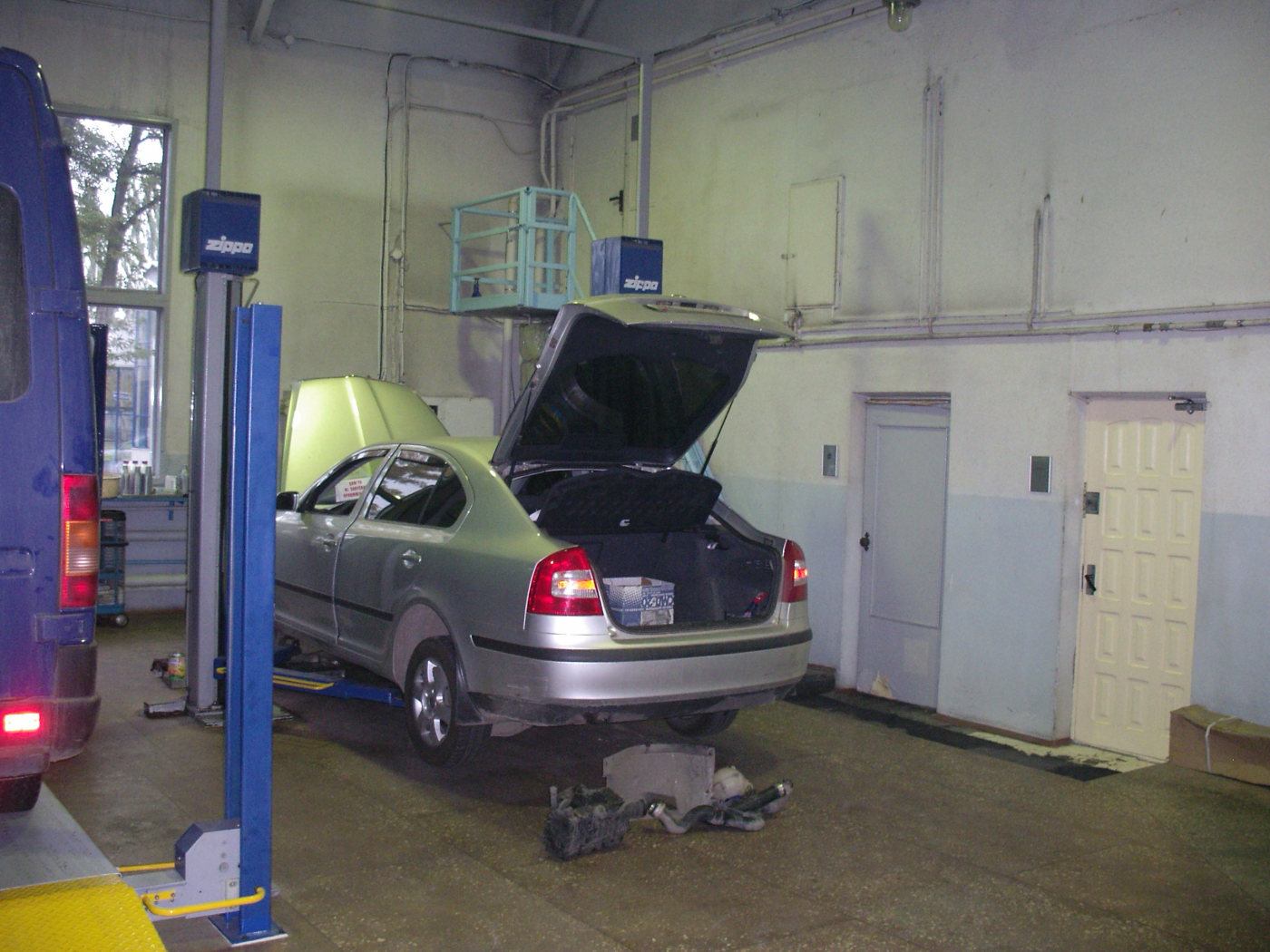 В боксе ТО имеются два подъемника 2т., один подъемник 3т., один подъемник 4т., стенд развал-схождения.